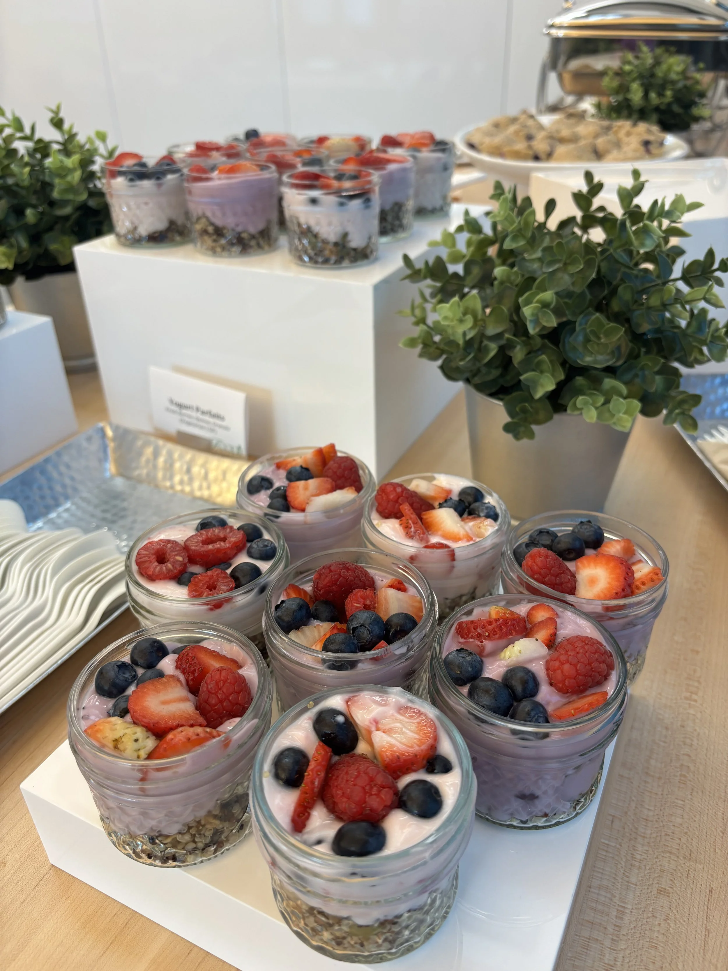 Yogurt Parfait, Mini Spinach Quiche, Fresh Sliced Fruit, Zucchini Bread